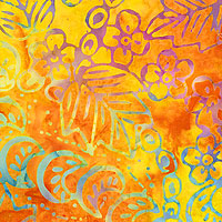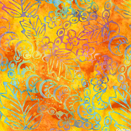 A lush landscape of garden florals are depicted in vivid hues within mottled batik textures. Batik, larger leaves are about 3-1/2", 'Ambrosia' from the 'Bali Samba' collection by Benartex Fabrics.