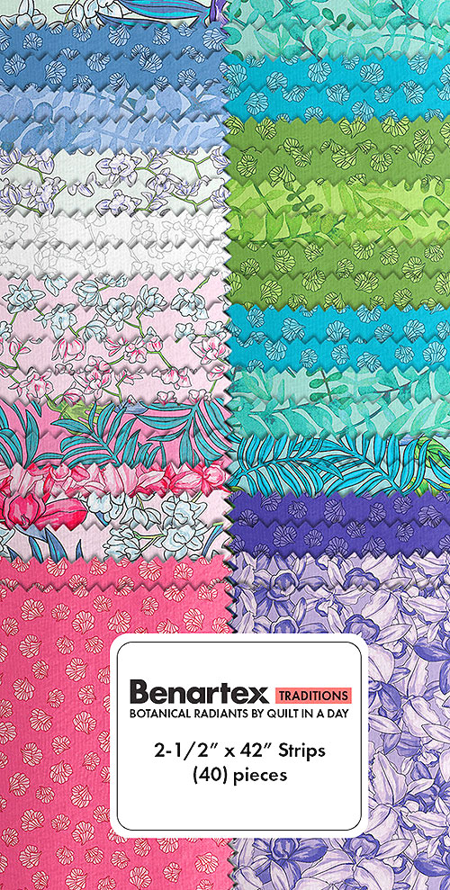 Lush blossoms and verdant greenery lend a natural elegance to this charming pre-cut! 'Botanical Radiants' collection strip pack by Quilt In A Day for Benartex Fabrics, pack includes forty 2-1/2" x 42" strips.