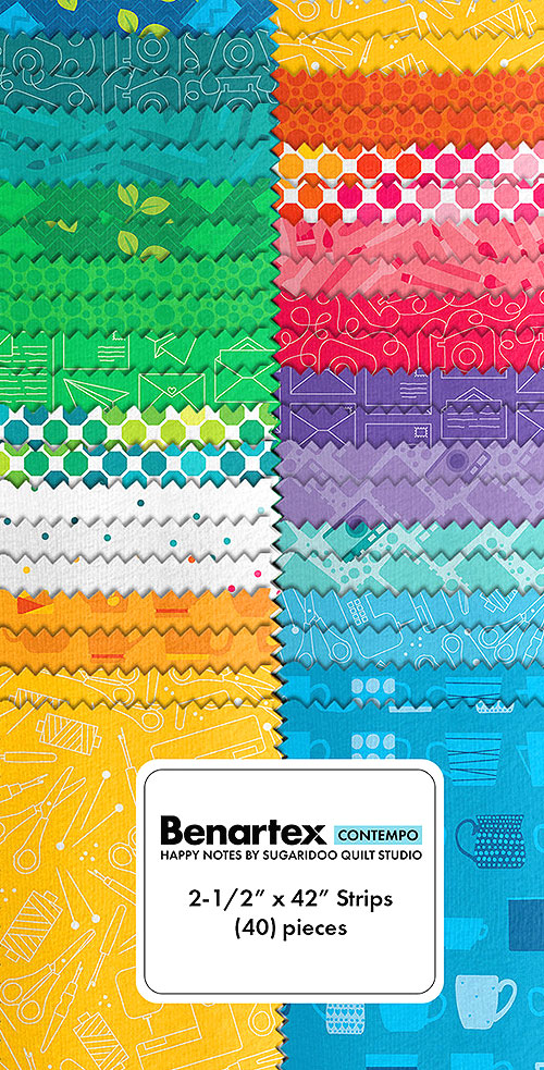 Pleasant designs are presented in a variety of options, making a versatile pre-cut that can be used in a wide array of projects! 'Happy Notes' collection strip pack by Sugaridoo Quilt Studio for Benartex Fabrics, pack includes forty 2-1/2" x 42" strips.