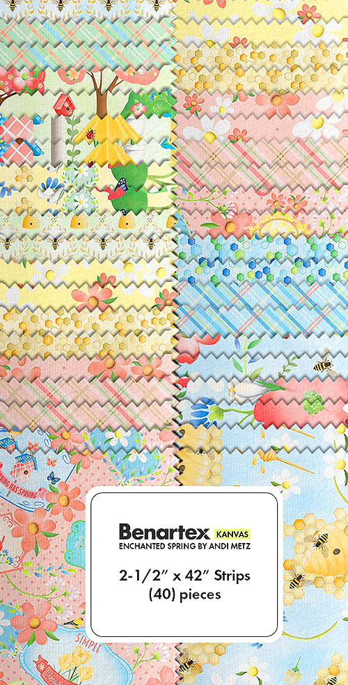 A collection of adorable birdhouses, honeybees, and lush florals are presented in soft pastels in this charming pre-cut! 'Enchanted Spring' collection strip pack by Andi Metz for Benartex Fabrics, pack includes forty 2-1/2" x 42" strips.