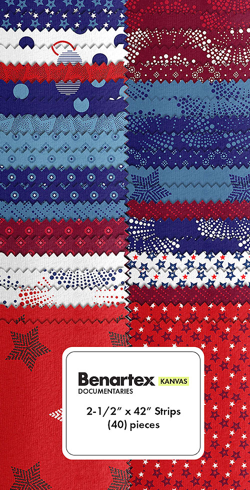 Stars, fireworks, and other patterns are proudly presented in the red, white, and blue of the American flag in this patriotic pre-cut! 'Documentaries' collection strip pack by Kanvas Studio for Benartex Fabrics, pack includes forty 2-1/2" x 42" strips.