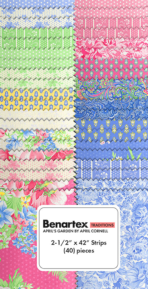 Soft florals and elegant patterns coalesce in this graceful pre-cut. 'April's Garden' collection strip pack by April Cornell for Benartex Fabrics, pack includes forty 2-1/2" x 42" strips.