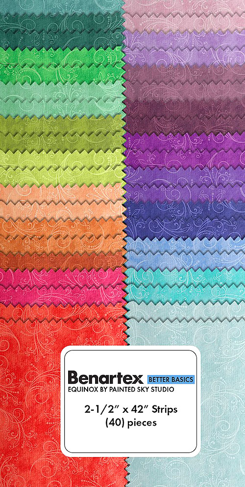 A simple pattern of swirly plant shapes is presented in a variety of vivid colors, making a versatile pre-cut that can be used in a wide array of projects! 'Equinox' collection strip pack by Painted Sky Studio for Benartex Fabrics, pack includes forty 2-1/2" x 42" strips.