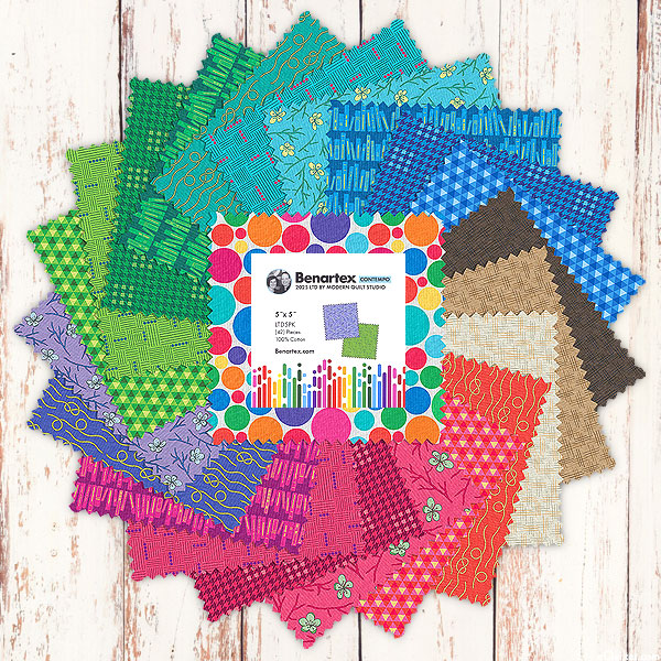 A variety of colorful prints from the Modern Quilt Studio's "2025 LTD" collection are together in this vibrant pre-cut. '2025 LTD' collection charm pack by Modern Quilt Studio for Benartex Fabrics, pack includes forty-two 5" x 5" squares.