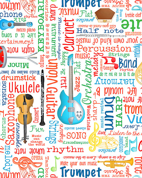 Various musical notes and instruments are scattered across the design with names of various musical terms written in the space between. Larger instruments are about 4", 'Musical Words' from the 'Making Music' collection by Andi Metz for Benartex Fabrics.