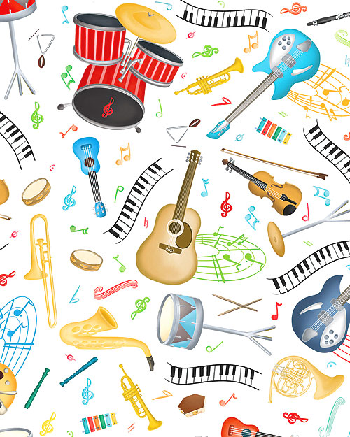 Various musical instruments are depicted across the design including guitars, drum sets, pianos, trumpets, tambourines, trombones, and ukuleles. Larger instruments are about 2-3/4", 'Musical Instruments' from the 'Making Music' collection by Andi Metz for Benartex Fabrics.