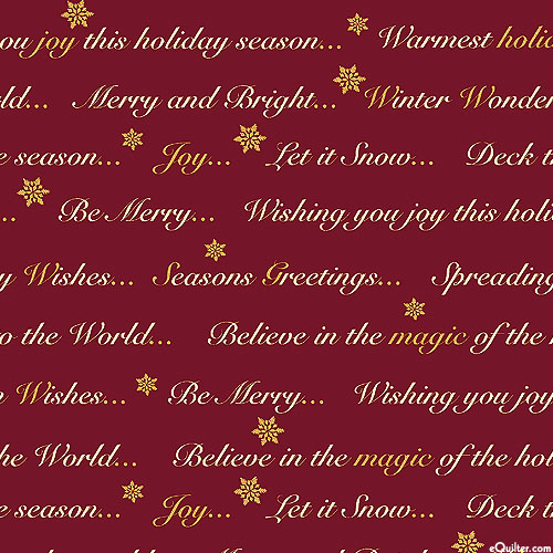 Merry words of joy and good wishes are written across the design with golden snowflakes floating in the spaces between. Taller script is about 1/2", text runs from selvedge to selvedge, with gold metallic, 'Holiday Greetings' from the 'Holiday Tidings' collection by Kanvas Studio for Benartex Fabrics.
