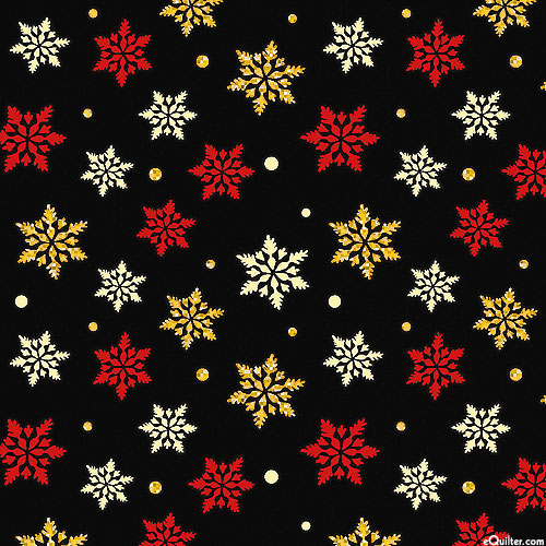 A festive flurry of snowflakes fall all over this Holiday-themed design. Larger snowflakes are about 3/4", with gold metallic, 'Snowflake Splendor' from the 'Holiday Tidings' collection by Kanvas Studio for Benartex Fabrics.