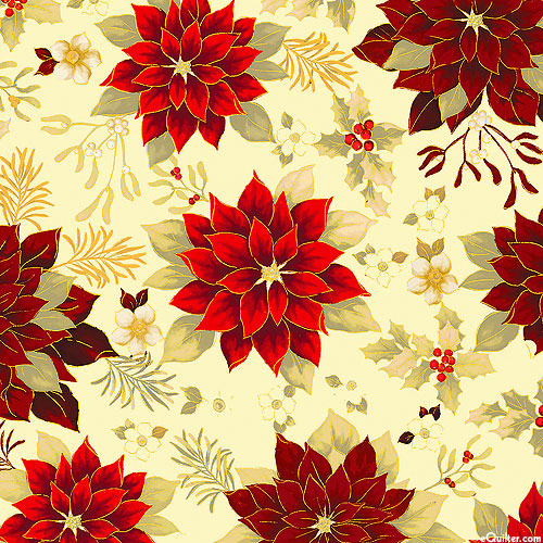 Flourishing poinsettia flower blossoms bring a festive air to this elegant Christmas-themed design. Larger poinsettias are about 3-1/2", with gold metallic, 'Holiday Garden' from the 'Holiday Tidings' collection by Kanvas Studio for Benartex Fabrics.