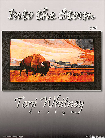 A lone bison stands in a grassy plain with a storm brewing in the distance over a mountain range. This fusible appliqué pattern allows even the ambitious beginner to create a quilt of stunning beauty. Color card included. Fabric Requirements: 6" x 11" Off White; 6" x 20" Cream; 5" x 20" Blush; 7" x 20" Yellow/Pink; 9" x 14" Yellow/Pink; 9" x 14' Yellow/Gold; 7" x 14" Orange Dot; 7" x 11" Light Brown; 7" x 11" Dk Brown; 7" x 20 Tan/Blue; 8' x 14" Tan/Gray; 16" x WOF Gray/Black Pint; 6" ax 11" plus 1/8 yd x WOF Black. 'Into the Storm' pattern by Toni Whitney Design, finished pattern is about 17" x 28".