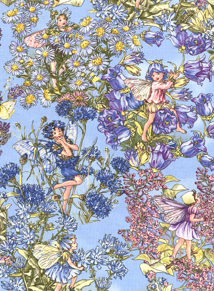 The magical flower fairies from the 'Flower Fairy' books of beloved British artist Cicely Mary Barker live on today in this whimsical collection of her playful watercolor illustrated flower fairies, sure to warm the hearts and imaginations of children and adults everywhere. These fanciful fairies take flight costumed as periwinkle blossoms among lavender, daisies, cornflower and Canterbury bells, inspiring fantasy and fun in all of your sewing and quilting adventures. Larger fairies are about 3 1/2", with silver metallic glitter, from the 'Periwinkle Flower Fairies' collection ©The Estate of Cicely Mary Barker, 2008, licensed by Copyrights Group for Michael Miller fabrics.