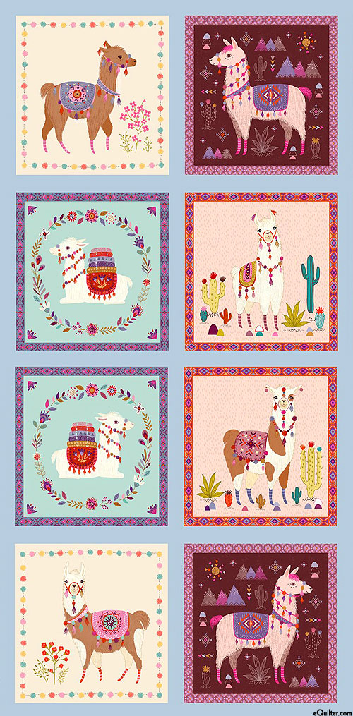 The designs on the eight frames each depict an adorable Llama that is ready for an adventure through the dessert. 24" panel, panel has eight frames about 9-1/2" x 9-3/4", 'Llama Panel' from the 'Llama Love' collection by Janna Krupinski for Michael Miller Fabrics. This image has been divided and stacked vertically to display the entire panel.