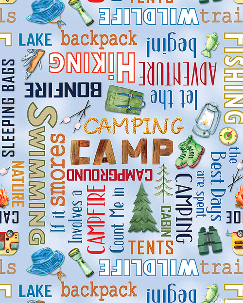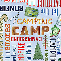 Camping gear is strewn across the design with words related to the love of camping written in the space between. Digitally printed, taller text is about 1-1/2", 'Camping Words' from the 'Live, Love, Camp' collection by Nicole DeCamp for Benartex Fabrics.