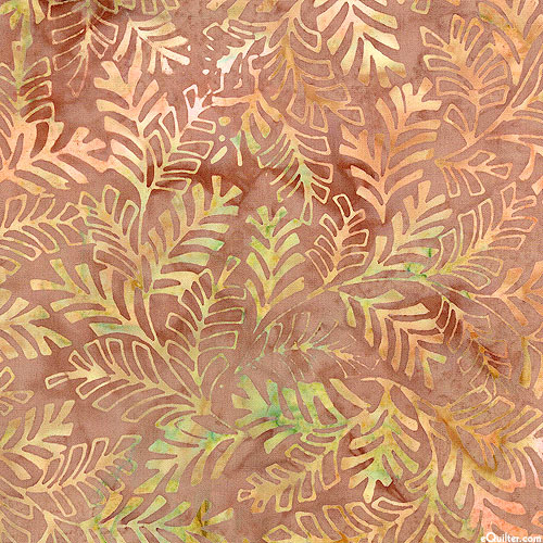 A lush landscape of leafy fronds are depicted in vivid hues within mottled batik textures. Batik, larger leaf fronds are about 2", 'Fern' from the 'Bali Sweet Rose II' collection by Benartex Fabrics.