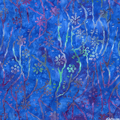 Lush florals blooming in the forest are depicted in vivid hues within mottled batik textures. Batik, larger flowers are about 3/4", 'Thunbergia' from the 'Bali Sweet Rose' collection by Benartex Fabrics.