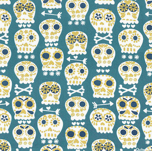 These decorative sugar skulls, crossbones, hearts, arrows and blossoms are part of the Day of the Dead celebrations that we love and that is such a prominent holiday in Mexico. The vivid hues and graphic, sharp edge designs are both contemporary and visually delicious! Larger skulls are about 1-1/4", with gold metallic, 'Bonehead' from the 'Novelties' collection by Michael Miller Fabrics.