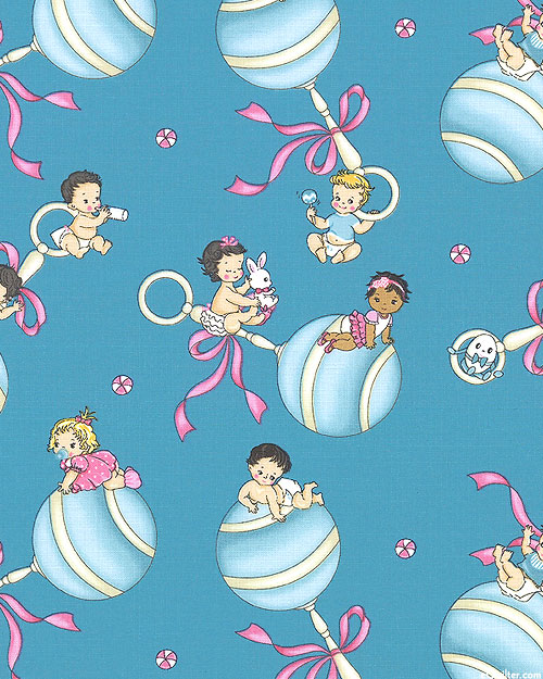 In this retro design, adorable little babies are seen playing with their favorite toys including rattles and stuffed animals. Larger objects are about 4", 'Baby Boomers' from the 'Baby Boomers' collection by Michael Miller Fabrics.