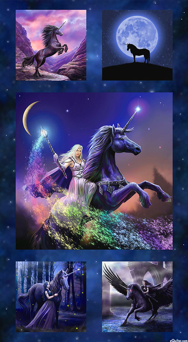 Panel blocks contain a collection of magical scenes including unicorns, pegasi, and sorcerers. Digitally printed, 24" panel, panel has one frame about 20" x 20", and four frames about 9" x 9", from the 'Unicorn Magic' collection by Anne Stokes for Clothworks.