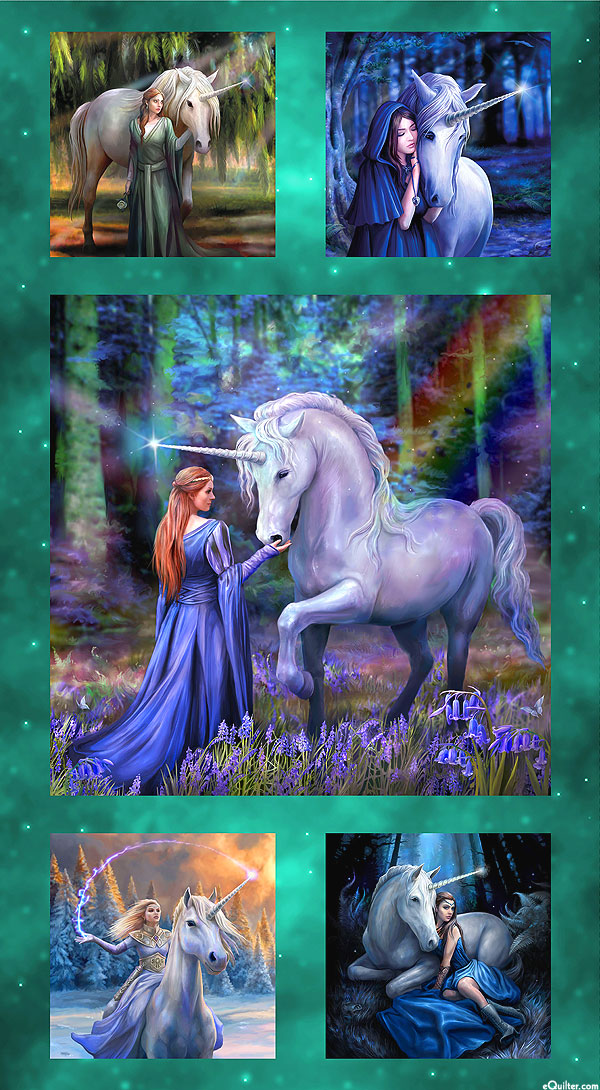 Panel blocks contain a collection of magical scenes featuring women dressed in fantasy clothing caring for their unicorn companions. Digitally printed, 24" panel, panel has one frame about 20" x 20", and four frames about 9" x 9", from the 'Unicorn Magic' collection by Anne Stokes for Clothworks.