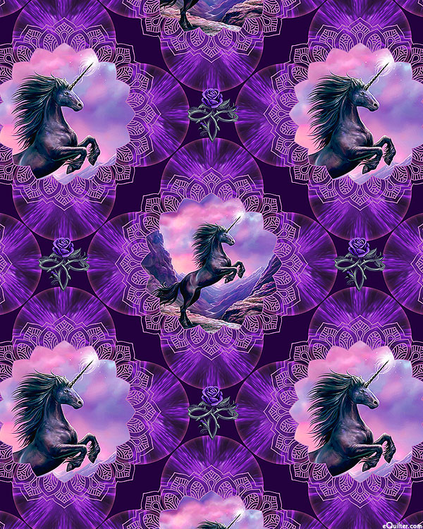 Magical medallions contain enchanting imagery of a mighty unicorn posed against a colorful sky with thorny roses in the space between. Digitally printed, larger medallions are about 3-1/2", from the 'Unicorn Magic' collection by Anne Stokes for Clothworks.