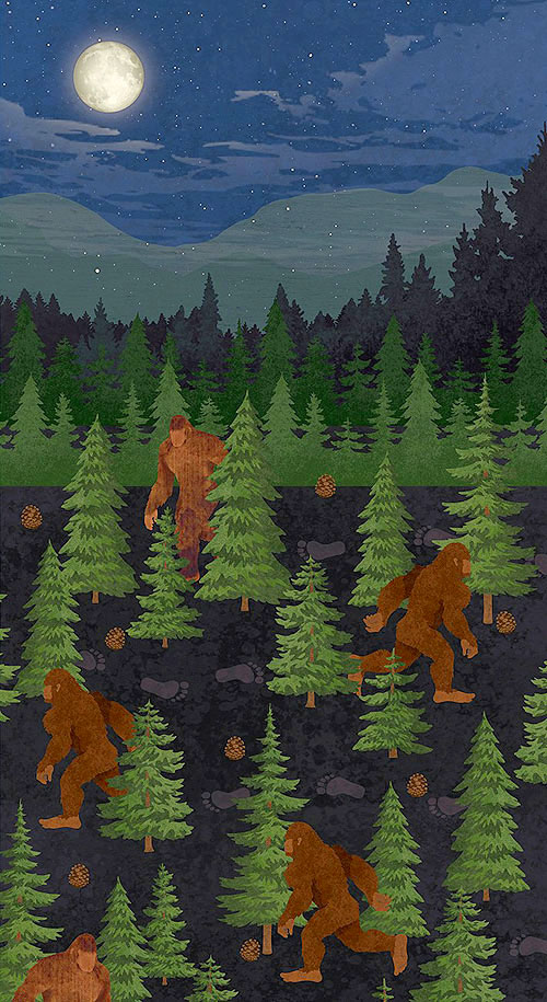 A Sasquatch wandering through a moonlit forest at midnight are glimpsed in silhouettes layered with colors across the panel. 24" panel, from the 'Bigfoot Country' collection by Lauren Rader for P&B Textiles.