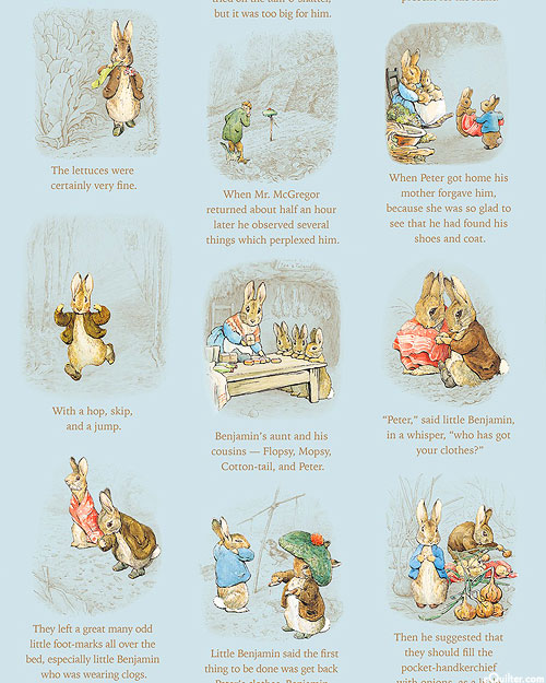 Iconic scenes from Beatrix Potter's beloved classic are depicted across the design. Digitally printed, larger scenes are about 2-1/2", from the 'Peter Rabbit and Benjamin Bunny' collection by Riley Blake Designs. Official licensed product. BEATRIX POTTER™. © Frederick Warne & Co., 2025. All Rights Reserved.