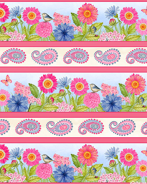 A lush landscape of flourishing flowers, plush paisleys, and small birds coalesce to create a captivating garden gala of texture and tone between the layers of this stunning stripe. Wider stripes are about 5", stripes run the length of the fabric, from the 'Paisley Punch' collection by Danielle Leone for Wilmington Prints.