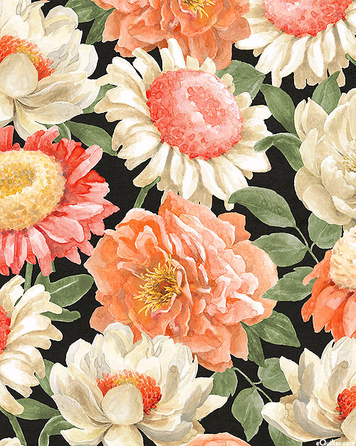 A lush landscape of flourishing flowers coalesce to create a captivating garden gala of texture and tone. Larger flowers are about 3", from the 'Peach Whispers' collection by Beth Grove for Wilmington Prints.