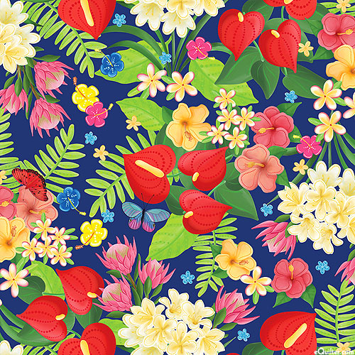 Lush tropical florals bloom boldly across the design as elegant butterflies flutter freely in the space between. Larger flowers are about 1-1/2", 'Island Time Flowers' from the 'Island Time' collection by Andi Metz for Benartex Fabrics.
