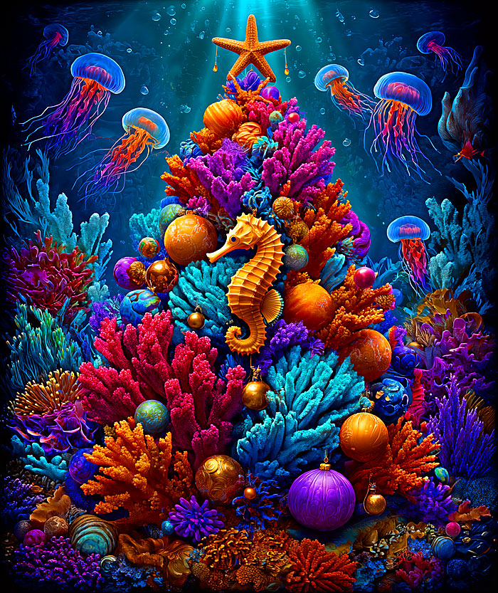 Under the sea an oceanic Christmas tree composed of coral is decorated in festive ornaments as a colorful variety of sea life swims nearby. Digitally printed, 36" panel, 'Christmas Tree Undersea' by the Rubin Design Studio, designed exclusively for eQuilter.