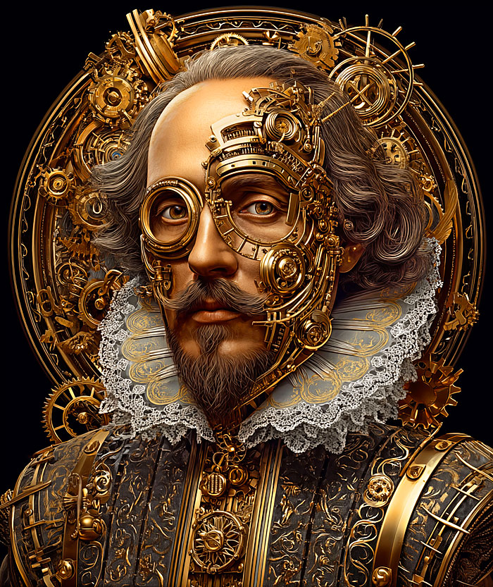 A steampunk rendition of William Shakespeare himself sees the famous figure from history decorated in a mesmerizing assortment of metallic and mechanical steampunk gear. Digitally printed, 36" panel, 'Steampunk Shakespeare' by the Rubin Design Studio, designed exclusively for eQuilter.