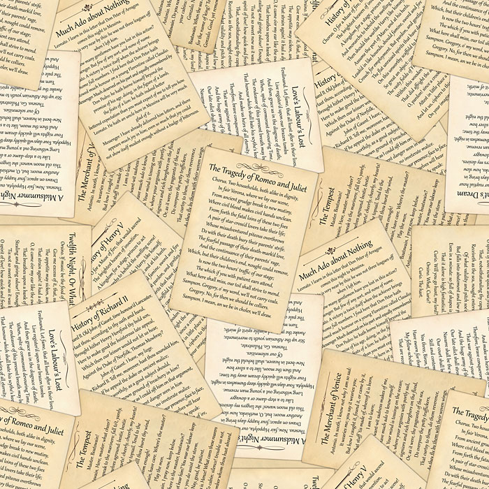 Scattered across the design are a pile of pages with Shakespeare's plays written on them in a beautifully penned script. Digitally printed, antique book pages are about 5", 'Shakespeare Pages Allover' by the Rubin Design Studio, designed exclusively for eQuilter.