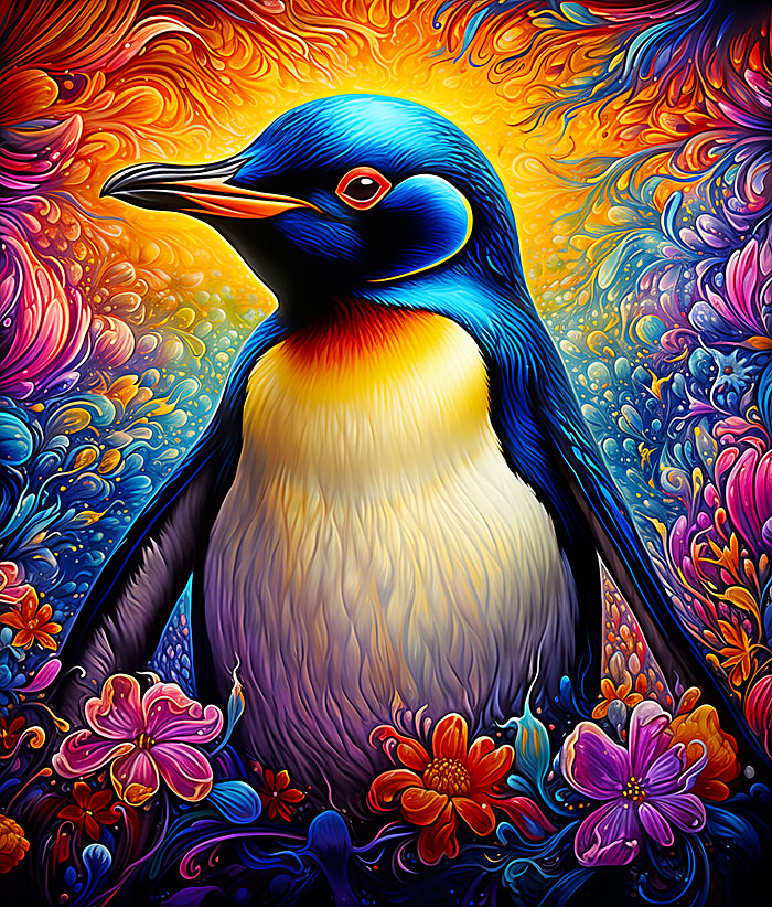 The captivating form of an intricately adorned penguin emerges from delicately illustrated patterns reminiscent of those found in mandalas and zentangle designs. Digitally printed, 37" panel, 'Magic Penguin' by the Rubin Design Studio, designed exclusively for eQuilter.