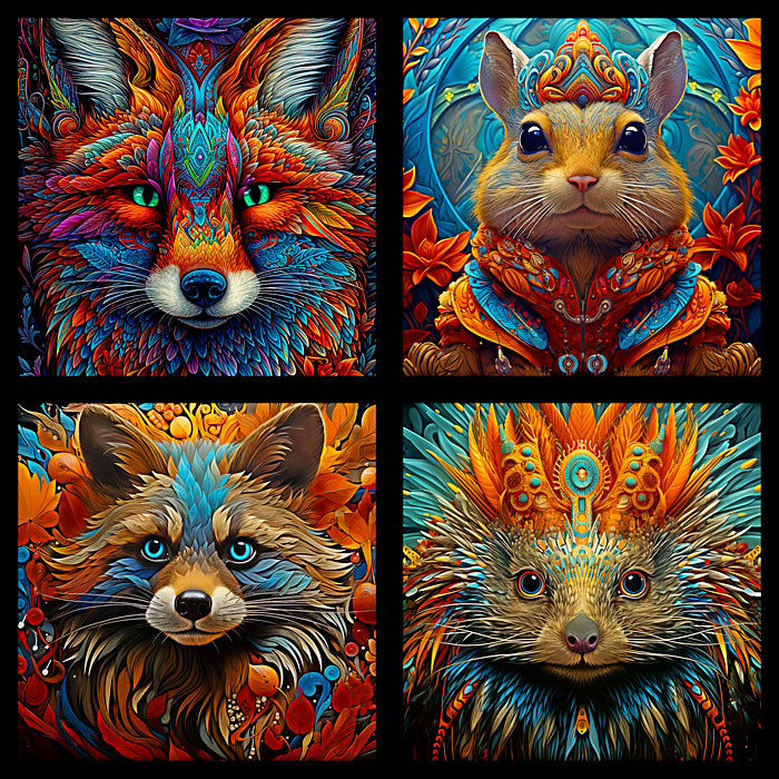 Panel blocks that can be sewn into pillows contain intricately adorned wild animals including a fox, squirrel, raccoon, and porcupine. Digitally printed, 43" panel, includes four 20" x 20" frames, 'Woodland Animals Pillow Panel' by the Rubin Design Studio, designed exclusively for eQuilter.