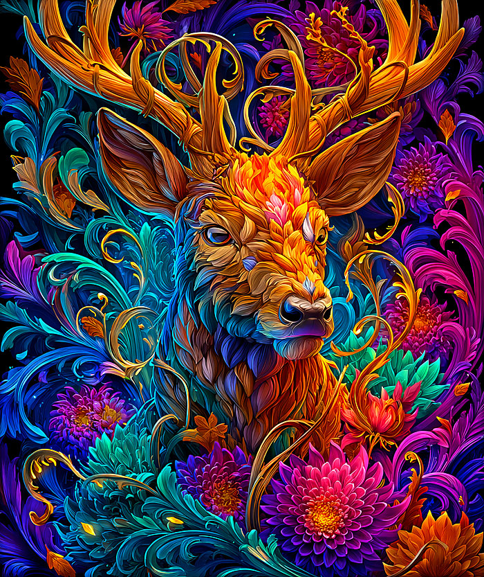 The captivating form of an intricately adorned deer emerges from delicately illustrated patterns reminiscent of those found in mandalas and zentangle designs. Digitally printed, 36" panel, 'Vibrant Deer' by the Rubin Design Studio, designed exclusively for eQuilter.