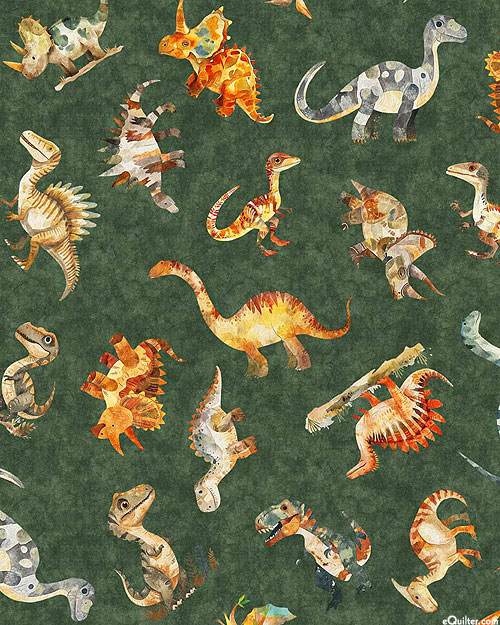 Scattered across the design are cute renditions of iconic dinosaurs including stegosaurus, brontosaurus, triceratops, brachiosaurus, and velociraptors. Digitally printed, larger dinosaurs are about 5", from the 'DinoROARS!' collection by Dan Morris for Quilting Treasures.