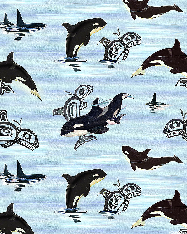 Dancing among indigenous art counterparts are majestic orcas swimming and jumping in the waves. Larger orca are about 4-1/2", from the 'Native Reflections' collection by Sue Coleman for Elizabeth's Studio.