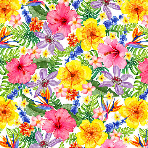 A lush landscape of flourishing flowers coalesce to create a captivating garden gala of texture and tone. Larger flowers are about 1-5/8", 'Tropical Garden' from the 'Paradise Awaits' collection by Nicole DeCamp for Benartex Fabrics.