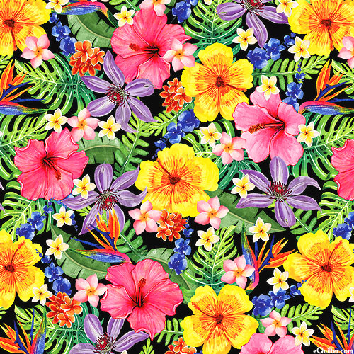 A lush landscape of flourishing flowers coalesce to create a captivating garden gala of texture and tone. Larger flowers are about 1-5/8", 'Tropical Garden' from the 'Paradise Awaits' collection by Nicole DeCamp for Benartex Fabrics.