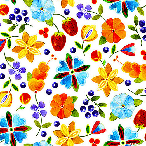 A summery toss of berries and flowers are scattered across this delightful design. Larger flowers are about 1/2", from the 'Woodland Delight' collection by Daniel Ramirez for Elizabeth's Studio.