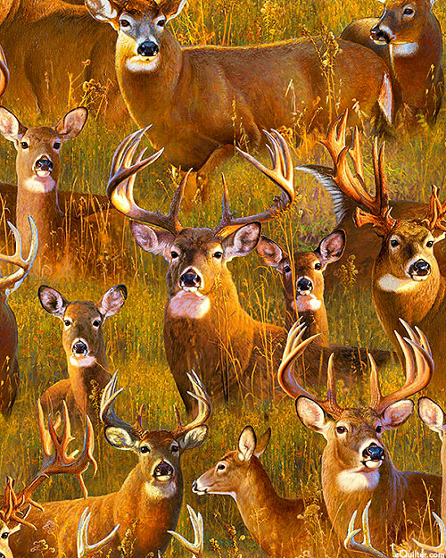 Elegant does and majestic bucks migrate across a grassy plain as a herd in this picturesque panel. Larger deer are about 5-1/2, from the 'A Buck Stops Here' collection by Hayden Lambson for Elizabeth Studios.