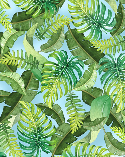 Palm fronds scattered all over evoke the relaxing tranquility of the tropics in this delightful design. Larger leaves are about 3-1/2", 'Leaves of Paradise' from the 'Paradise Awaits' collection by Nicole DeCamp for Benartex Fabrics.