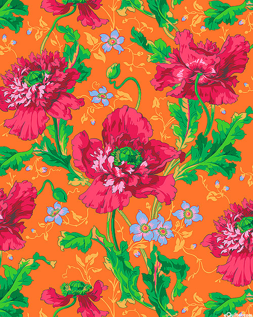 A lush landscape of flourishing flowers coalesce to create a captivating garden gala of texture and tone. Larger flowers are about 6-1/4", 'Papaver' from the 'August 2024 Kaffe Fassett Collective' collection by Philip Jacobs for Free Spirit.