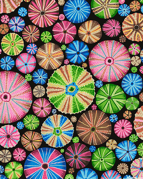 Circular sea urchins of a variety of colors and sizes are scattered across this charming aquatic design. Larger circles are about 5-1/4", 'Urchin' from the 'August 2024 Kaffe Fassett Collective' collection by Philip Jacobs for Free Spirit.