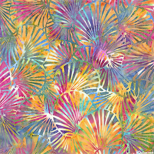 Leafy fans that coalesce into a dense canopy are depicted in vivid hues within mottled batik textures. Batik, larger fan shapes are about 2-1/2", from Hoffman Fabrics.