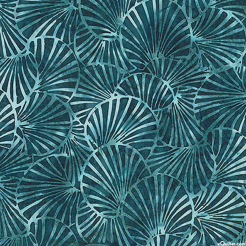 Leafy fans that coalesce into a dense canopy are depicted in vivid hues within mottled batik textures. Batik, larger fan shapes are about 2-1/2", from Hoffman Fabrics.
