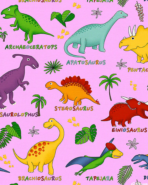 Teach your little one the names of various dinosaurs with this colorful children's design! Larger dinosaurs are about 5", from the 'Lost World' collection by Fabri-Quilt.