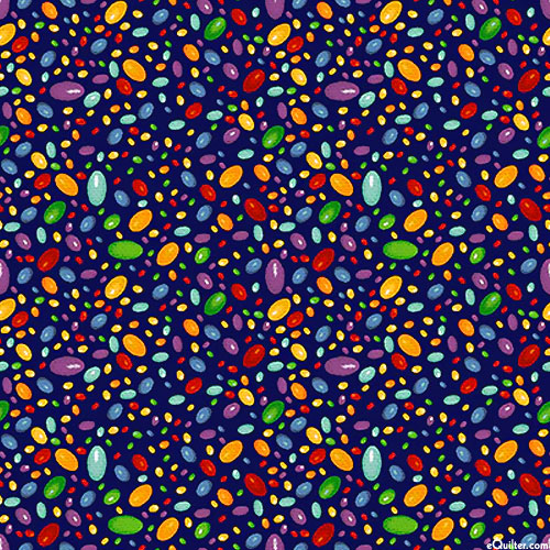 Colorful dinosaur eggs are scattered all over a solid background. Larger dinosaur eggs are about 3/8", from the 'Lost World' collection by Fabri-Quilt.