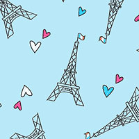 Eiffel Towers are tossed across the design with hearts scattered in the space between. Eiffel Tower is about 1-3/4", 'Love Paris' from the 'Parisian Pups' collection by Kanvas Studio for Benartex Fabrics.