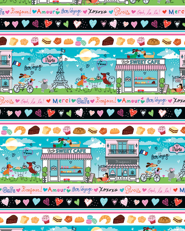 Charming canines enjoy the French atmosphere of a Parisian plaza as they are seen riding bicycles, enjoying coffee, and visiting bakeries. Wider stripes are about 5-3/4", stripes run the length of the fabric, 'Parisian Pups Stripe' from the 'Parisian Pups' collection by Kanvas Studio for Benartex Fabrics.